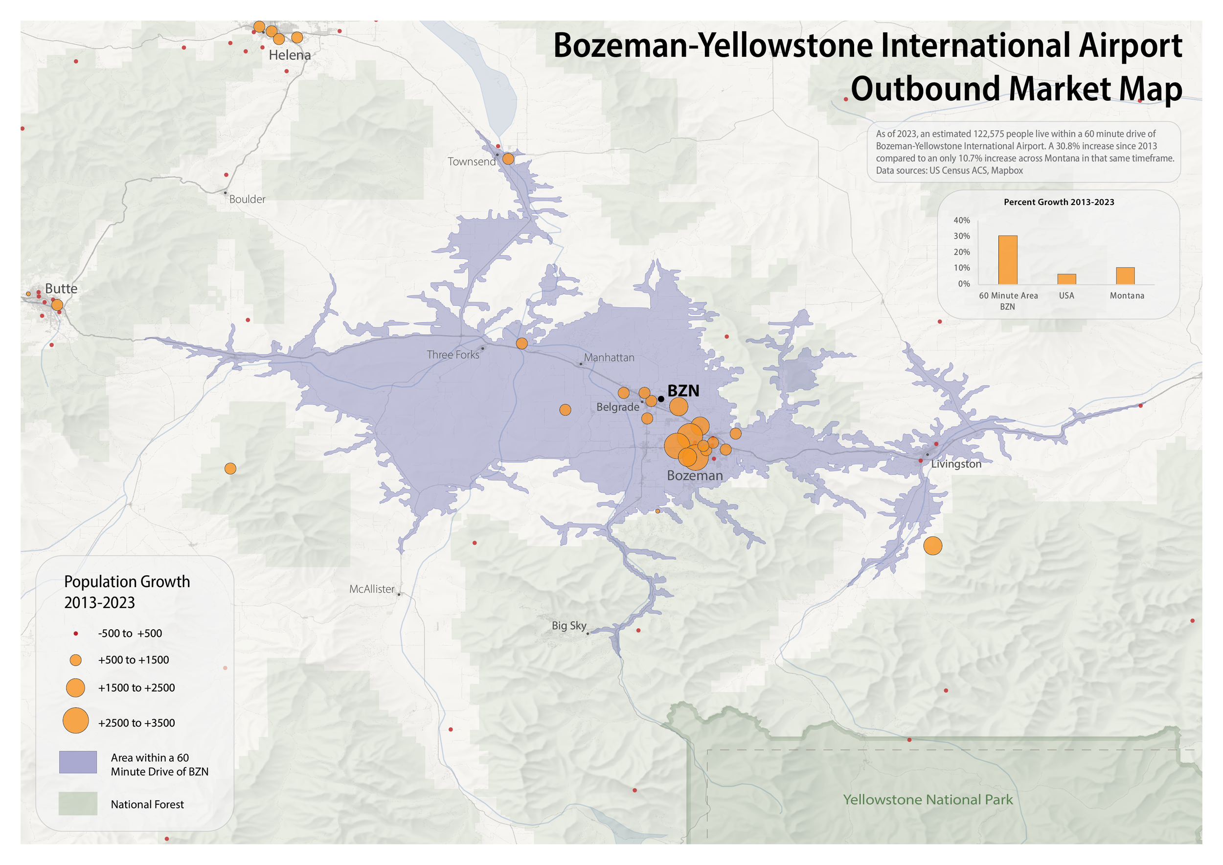 On the outbound traffic side, Bozeman is known to be one of the fastest-growing cities in the country. I found that the population within a 1-hour drive of BZN has grown by over 30% over 10 years, compared to just over 10% across Montana in the same timeframe.The Bozeman area’s status as both a winter and summer tourist destination, in addition to having a rapidly growing local population, allows it to support more nonstop flights than many cities of equal or greater population. If you’re interested in a similar set of market maps for your airport, I’m happy to chat at colman@colmanbashore.com.