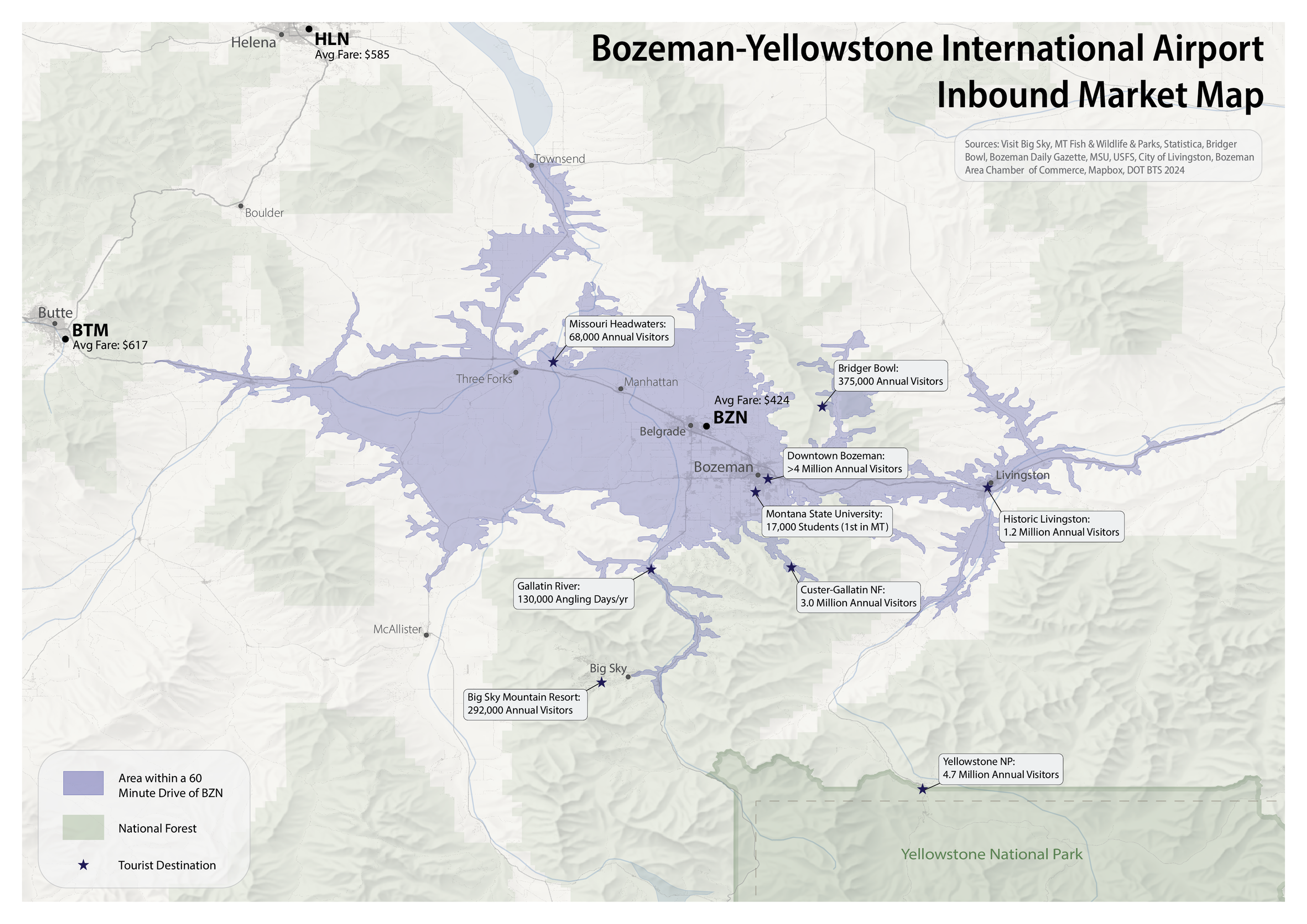 These demo maps serve as an example of leveraging spatial data to demonstrate potential demand at an airport. For inbound tourism traffic, Bozeman-Yellowstone International Airport (BZN) is the gateway to Yellowstone National Park, which tallies more than 4 million visitors a year - primarily in the summer months. However, tourists also visit in the winter for destinations such as Big Sky Mountain Resort. The dispersed nature of the area means that the next closest airport larger than BZN is Salt Lake City, a 6-hour drive away.
