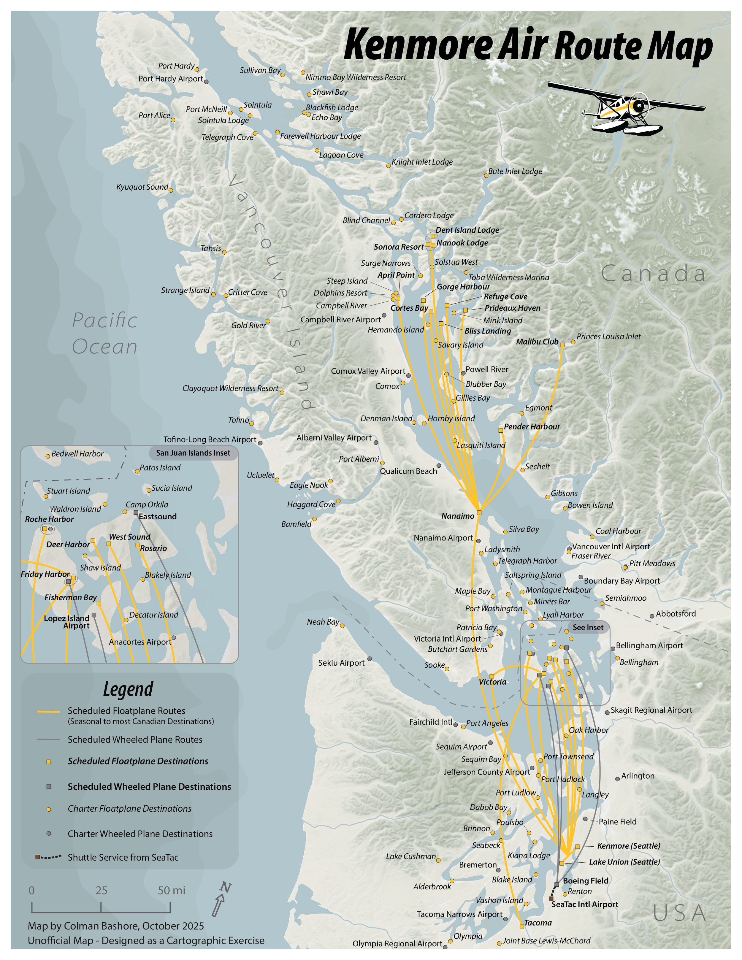 I created this map as a cartographic exercise in designing route maps. The unique challenges of this map were showing the destinations and routes in a dense area, in addition to showcasing both charter and scheduled destinations. I also hoped to capture some of the characteristics of the northwest landscape that Kenmore Air flies over.