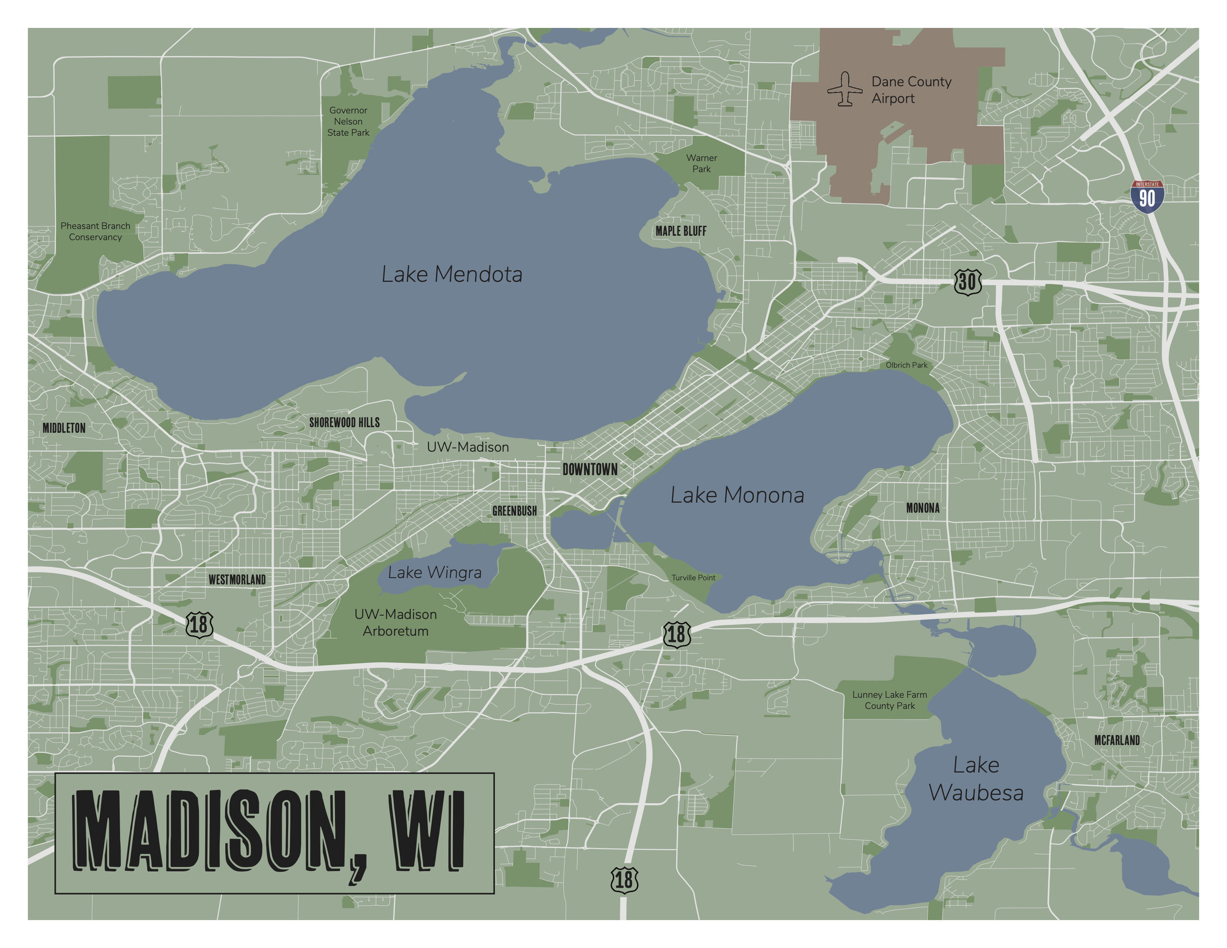 This map was a birthday present for my dad who grew up in Madison, Wisconsin and loves its beautiful parks and green spaces. This map is intended to be a poster and focuses on the various green spaces of the city.